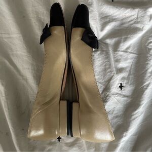 tan with black cap toe and black fabric bow