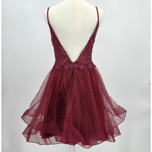 Pageant-ready May Queen couture burgundy party dress with intricate beaded bodice and layered glitter tulle skirt. Features a plunging illusion neckline, adjustable spaghetti straps, and a dramatic low V-back. Perfect for prom, pageants, formal dances, or any event where you want to stand out.