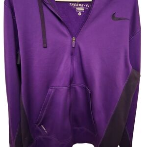 Nike Dri Fit Zip Up Hoodie in Purple and Black Features a front zipper and convenient pockets. Perfect for warmth and comfort. EUC