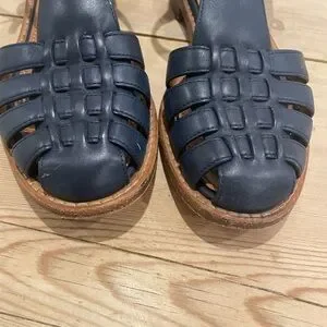 Church’s navy fisherman sandal with minimal wear. Worn less than 10 times if that. In a size 35. I wear a size 36.5 and found I needed to size up in this brand. Very comfortable and a classic shoe that will last a life time. Minimal wear pictured.