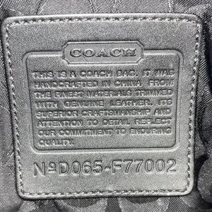 This is a Coach F77002 Black Nylon & Leather Weekend/Carry-On Bag. It is a large nylon tote bag with leather handles and trim, and silver-tone hardware. The bag features a double top handle, an outside pocket, a top-zip closure, and a black nylon lining with interior pockets. It is suitable for travel, weekend trips, or as a carry-on bag.