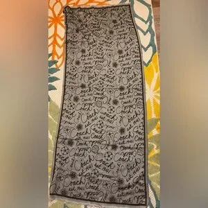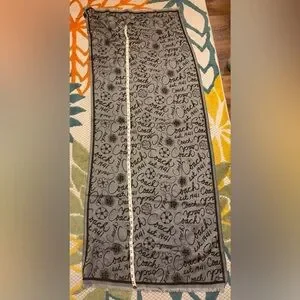Gorgeous Coach wrap featuring the signature “Coach est. 1941” script and floral jacquard pattern in gray and black. Made of soft wool-silk blend — cozy yet lightweight enough to wear year-round. Finished with short fringe edges.