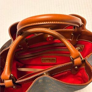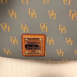 Stylish gray shoulder bag with brown handles. Features iconic Dooney & Bourke logo pattern. Perfect for everyday use.