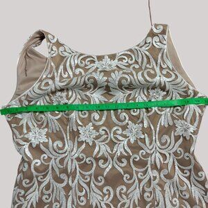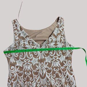 This elegant dress features a beautiful beige base with intricate white floral patterns. Perfect for any occasion, it combines style and comfort effortlessly.