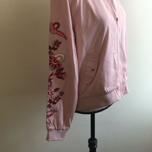 Gorgeous embroidered baby pink bomber jacket size Large, wonderful design on the sleeves in different shades of pinks, brand new with tags, small stains on the arm see photos please.