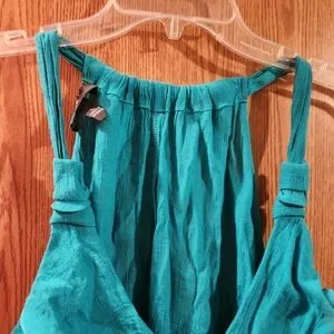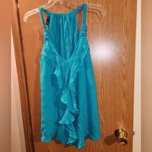 This is an absolutely gorgeous tank top with pretty ruffles on front! It is a blue color with a slight hint of green. It has an inner layer on the shirt. The top is slightly sheer.