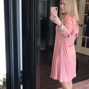 The fabric is Rayon and spandex. A pretty, demure dusty rose/light coral. This swing dress has a plain-as-can-be front and adorable ruffle detail at the sleeves and in back. In the pictures I’m wearing size medium which fit well — I am size 4-6 and I like the loose swingy, fit.