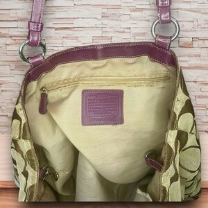 Stylish Coach shoulder bag. Features gold and brown pattern. Elegant design with sturdy handles.Sold As is Guc