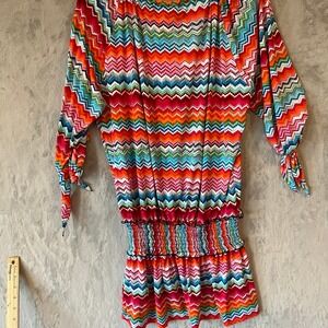 Keywords: La Blanca, cover up, swim cover up, beach dress, resort wear, chevron print, multicolor, off the shoulder, tie sleeve, smocked waist, summer dress, swimwear, vacation dress, women's fashion