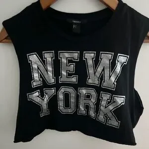 #Forever21 #Y2KStyle #NYCGraphic #CropTop #Streetwear #MadeInUSA #100Cotton #VintageVibes #TrendyTee #PoshStyle #Forever21Top #Y2KFashion #SilverLettering #CroppedTee