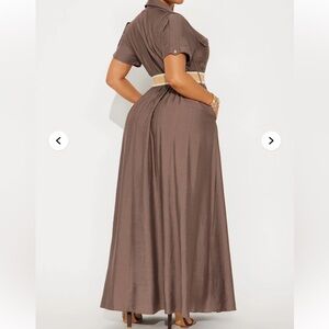 Elegant brown maxi dress featuring a stylish belt. Perfect for any occasion.