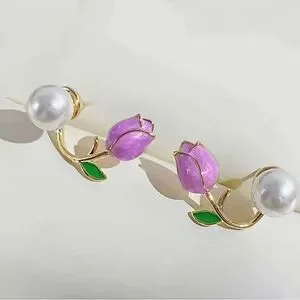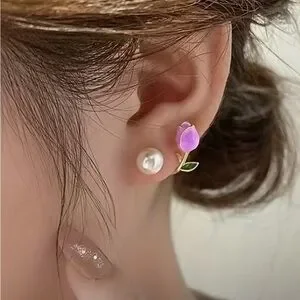 Trendy Elegant Purple Tulip Flower Pearl Stud Earrings, Women's Stud Earrings
