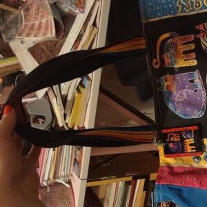 Artistic tote with vibrant patterns. Features rich colors and unique design.handle is about 5 or 6 inches long from the bag to the top of the strap.