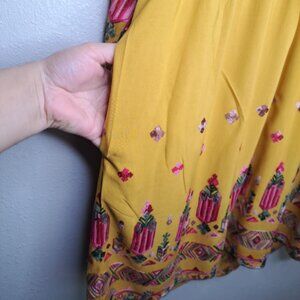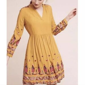 Anthropologie Floreat Raella Dress Embroidered Long Sleeve V-neck Mustard Yellow Small with Pockets Pullover