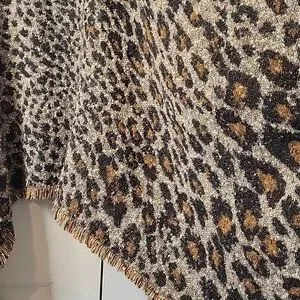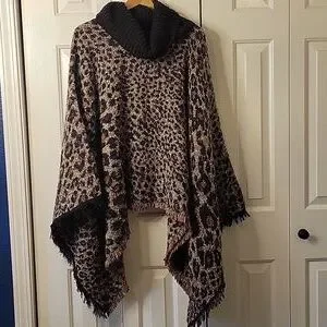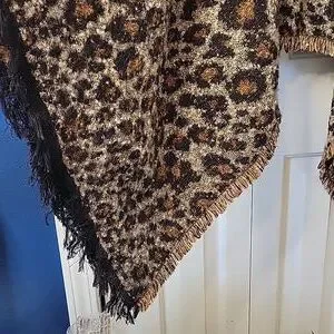 Stylish leopard print poncho with black fringe. Perfect for a chic look.