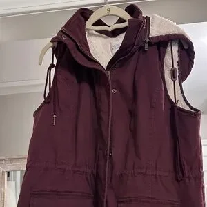 Beautiful Sherpa lined with weight to it, hooded, very warm, cinch drawstring waist, zips and snap buttons for closure. Smoke free and fragrance free. Size Large Burgundy/wine in color