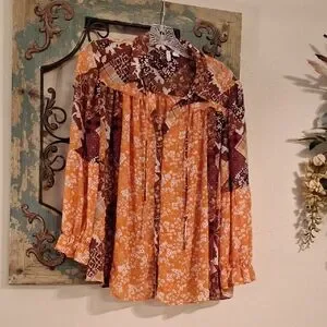Cato Floral Patchwork Blouse in Orange and Brown. NWOT Size Large