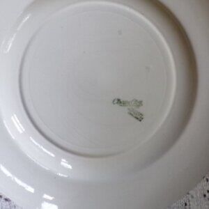 The maker's mark stamp is Clarice Cliff, Newport Pottery Co, England with 2 blue lines. The plate is in excellent shape with a few small wear spots in the yellow border and gold trim. There is no wear on the scene or gold trim. It looks to have been a display piece.