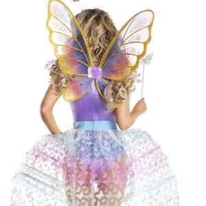 Flit throughout the forest in this Butterfly Fairy costume featuring an iridescent purple bodysuit with underwire cups, pink lace-up detailing, butterfly appliques, a back zipper closure, a cheeky cut back, a blue waistband, a long, sheer open skirt with an allover colorful butterfly design, matching mini butterfly wings with shoulder straps.