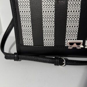 Handbag known for its black and white stripe design and the embellishments of Karl Lagerfeld's iconic cat, Choupette. The satchel is characterized by its small, structured shape and features a top handle as well as a removable crossbody strap, offering versatile carrying options. It typically has a zip-top or bridge snap closure and itinclude interior and exterior pockets for organization. The bag is often made of materials such as faux leather or polyvinyl chloride.