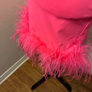 Vibrant hot pink mini dress with feather hem. Spaghetti straps. Bold and playful style. No rips or stains new with tags offers are welcome bundle and save on shipping. Size small.