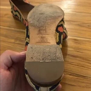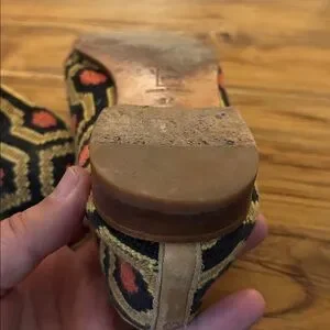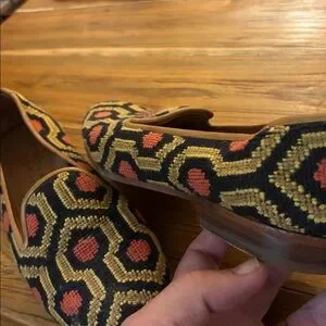 Chic needlepoint loafers with a bold geometric pattern. Features black, gold, and red tones.