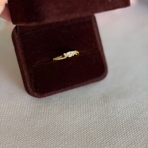 This elegant gold-tone ring features a stunning three-stone centerpiece accented with sparkling cubic zirconia stones along the band. A perfect mix of timeless elegance and modern shine.