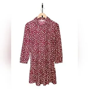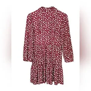 Elegant burgundy dress with charming polka dots. Features long sleeves and a flattering fit. Ideal for versatile styling.
