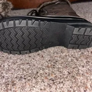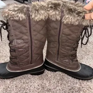 Stylish quilted boots with fur trim. Lace-up design with buckle accents. Perfect for cold weather.