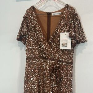 Elegant bronze sequin gown with short sleeves. Features a wrap-style bodice. Ideal for prom or special events.