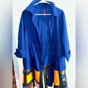 Elegant royal blue shirt/duster by Gitano. Features a striking patchwork skirt. Was made w an 18/20 shirt