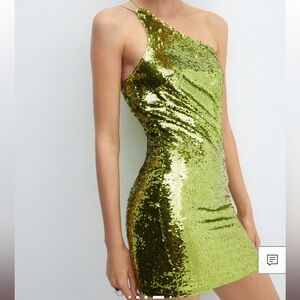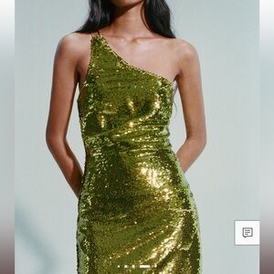Stunning one-shoulder dress with shimmering gold sequins. Perfect for a night out.