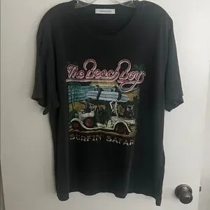 Short sleeve tee with 'The Beach Boys' graphic. Features a vintage car and surfboards. Perfect for casual wear.