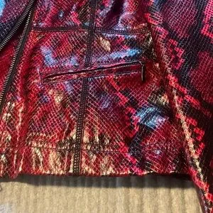 Elevate your style with this striking red snake print jacket. Perfect for adding a bold touch to any outfit. Size 14. But more like a 10-12