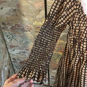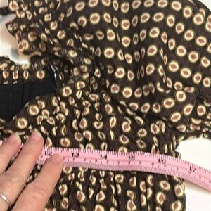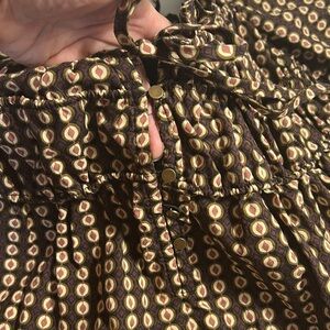 Three people star dip, tiered, black combo print ruffle neck and three-quarter sleeves, smocked back and hidden side pockets back in front tie details and buttons in front belt not included measurements in pics check all pics comment with any questions.