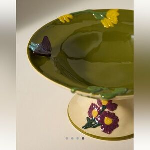 Sweet, handpainted floral and fauna motifs, raised in gentle relief, flit across this charming stoneware collection.