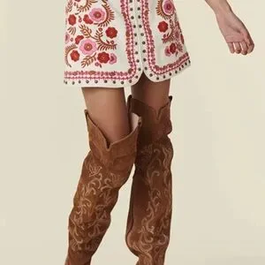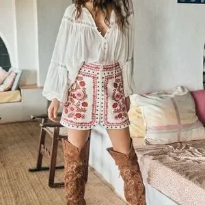 Made with comfortable stretch linen, this skirt features custom embroidery and hardware for a unique touch. The metal exposed zipper at the back waist adds an edgy element. Show off your bold side with this statement piece!