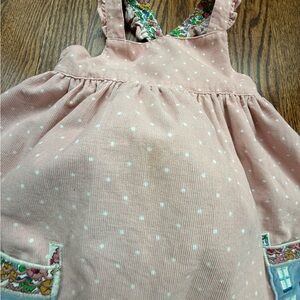 GUC fine wale pink corduroy pinafore (pinnie) dress. White polka dots. Embroidered houses featured on skirt, which also double as functional pockets. The straps criss cross in the back and have ruffles on them. Straps are adjustable with two different buttons. Lined in liberty fabric. So sweet!