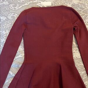 Chic deep red dress with long sleeves and square neckline. Ideal for versatile styling.