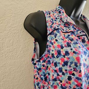 This is a sleeveless golf shirt by EP NY. It features a blue and red ditzy floral print and a zipper on the chest.