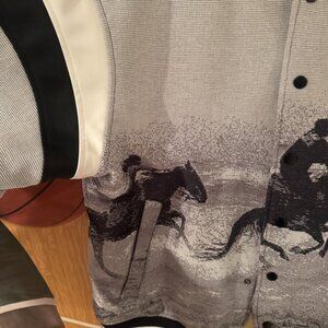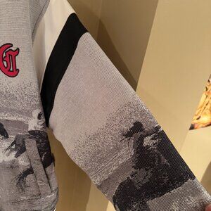 Front & sleeves feature woven grayscale cowboy horseback riding graphic