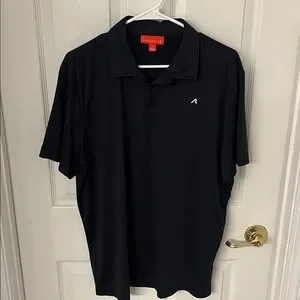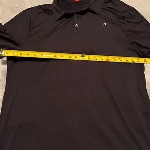 Black Redvanly golf polo with white stripes on back. Size large. Brand logo on chest and gold course logo on sleeve. Polyester / spandex for comfort and stretch.