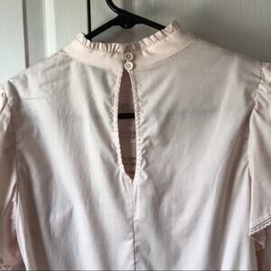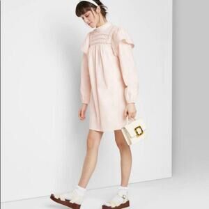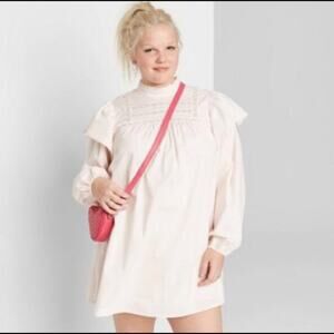 NWOT Wild Fable Victorian look babydoll dress with attached polyester slip underneath, pale pink with high ruffle neckline, keyhole back with 2 button closure, large capped puffy elastic long sleeves. Adorable in a variety of ways!