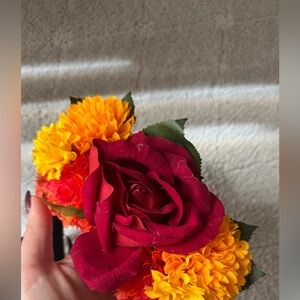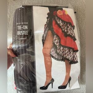 . Day of the dead tie on bustle skirt ruffle with tulle skeletons, and flowers. As well as a headband with Marigold roses and ribbons.