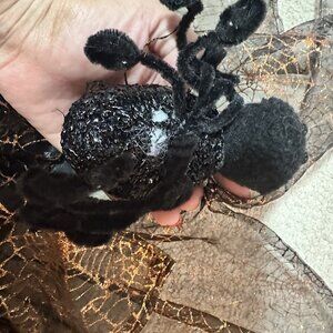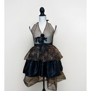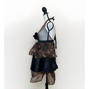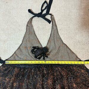Halloween black and orange sparkly witch apron in women’s one size. Ties in back and around neck. One neck tie could be stitched more. Sparkly spider on front. Spider has some flaws and strings coming out. Hard to see. Sheer apron with ruffles. Apron has minor flaws good for wearing on Halloween or theme. Works well.