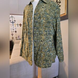 Elevate your style with this elegant floral green button-up jacket. Perfect for any occasion, this jacket combines comfort and fashion effortlessly.
