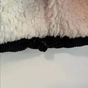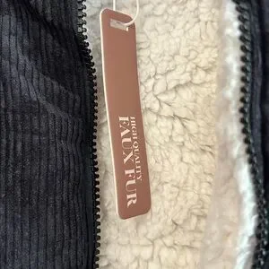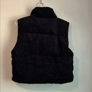 Black corduroy vest with two front pockets and Sherpa lining. Stock photos shown for style and fit.