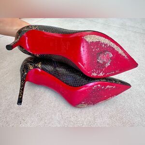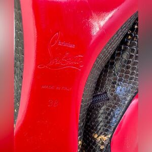 This is authentic pair of CHRISTIAN LOUBOUTIN So Kate Leather Snake Embossed Dark Brown Boots 85