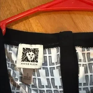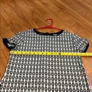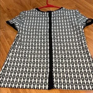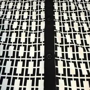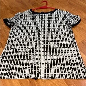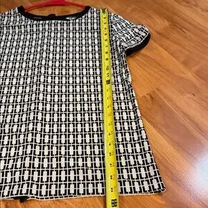 Chic short-sleeve top. Black and cream geometric pattern. Round neckline. Perfect for casual or office wear.