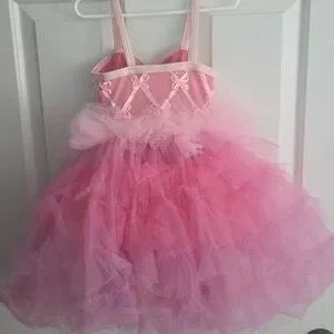 Charming pink dance costume with layered tulle skirt. Features delicate bow accents and spaghetti straps.